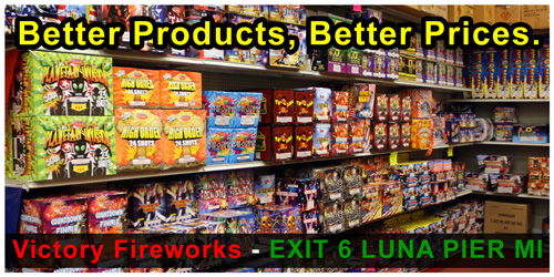 Victory Fireworks is located off of Exit 6, Luna Pier Rd on I-75, just north of the Ohio/Michigan border. The Victory Fireworks store has the best selection of ground and aerial fireworks. We know what our competition offers and we take the challenge against any other fireworks on the market.
